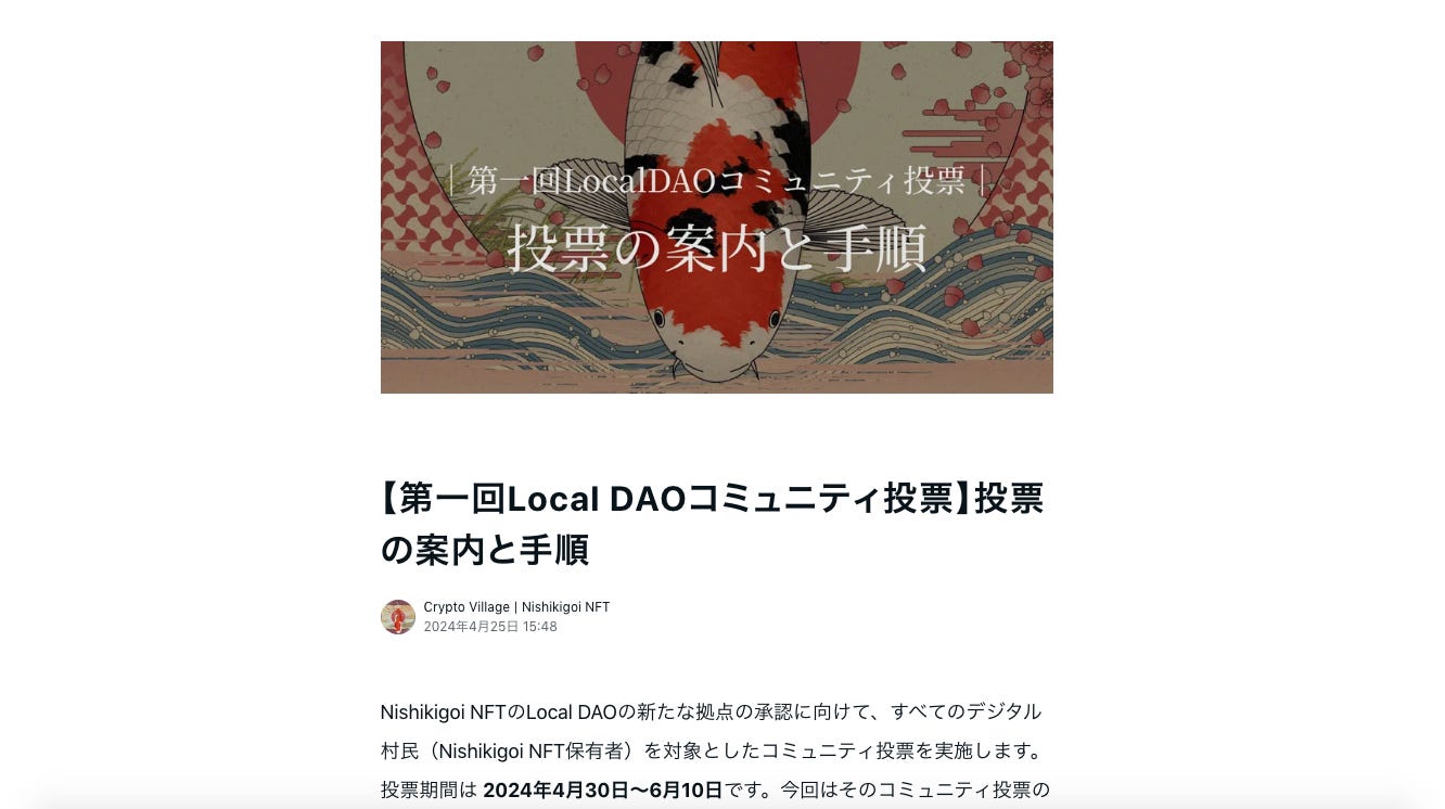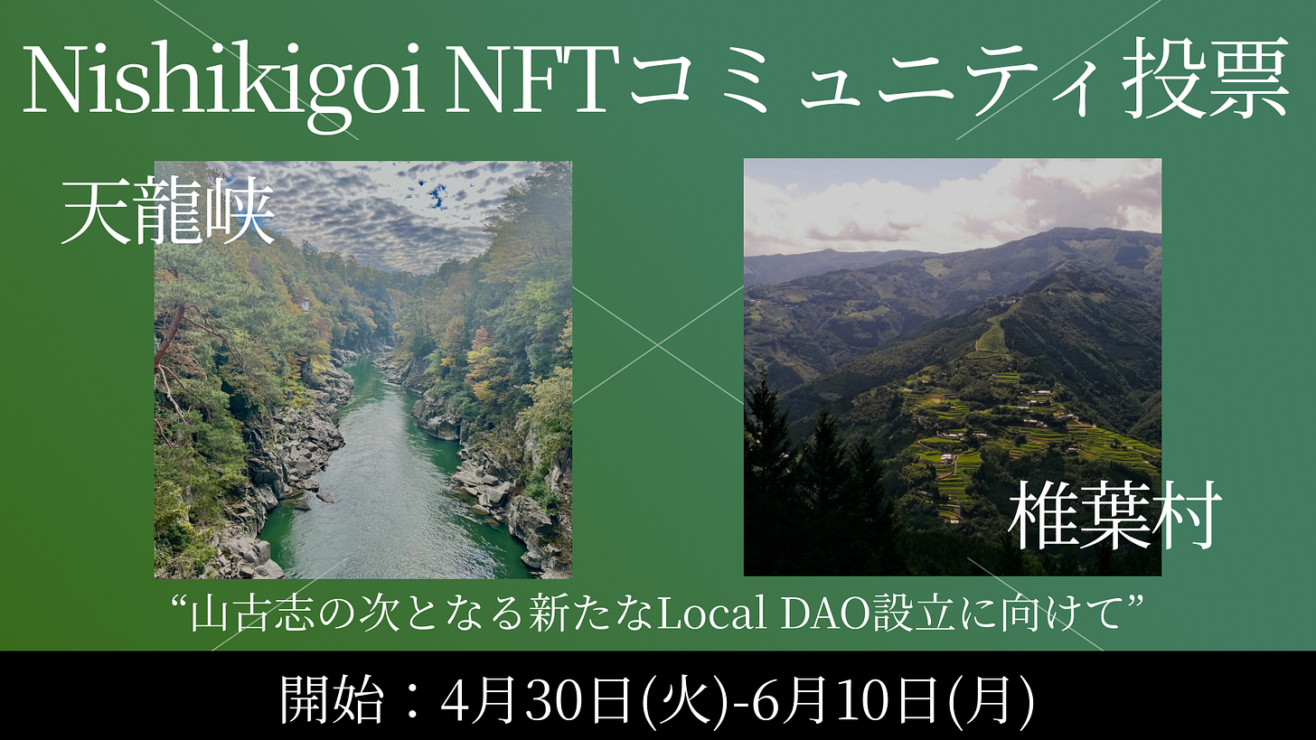 本日4月30日からNishikigoi NFTでは全デジタル村民を対象としたコミュニティ投票を開始いたします。今回の投票は「山古志の次となる新たなLocal DAOの設立に向けて」ということで候補地である「天龍峡(長野県)」「椎葉村(宮崎県)」の承認可否を問うものです。